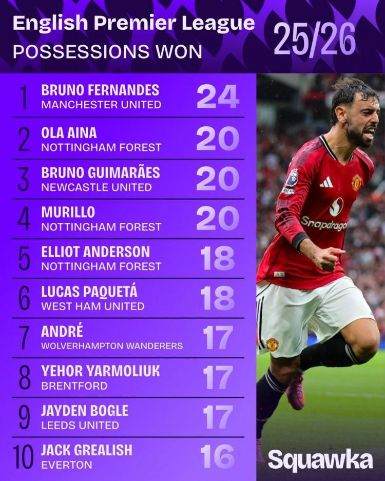 新赛季英超赢得球权榜:B费24次居首 布鲁诺&帕奎塔&格拉利什在列